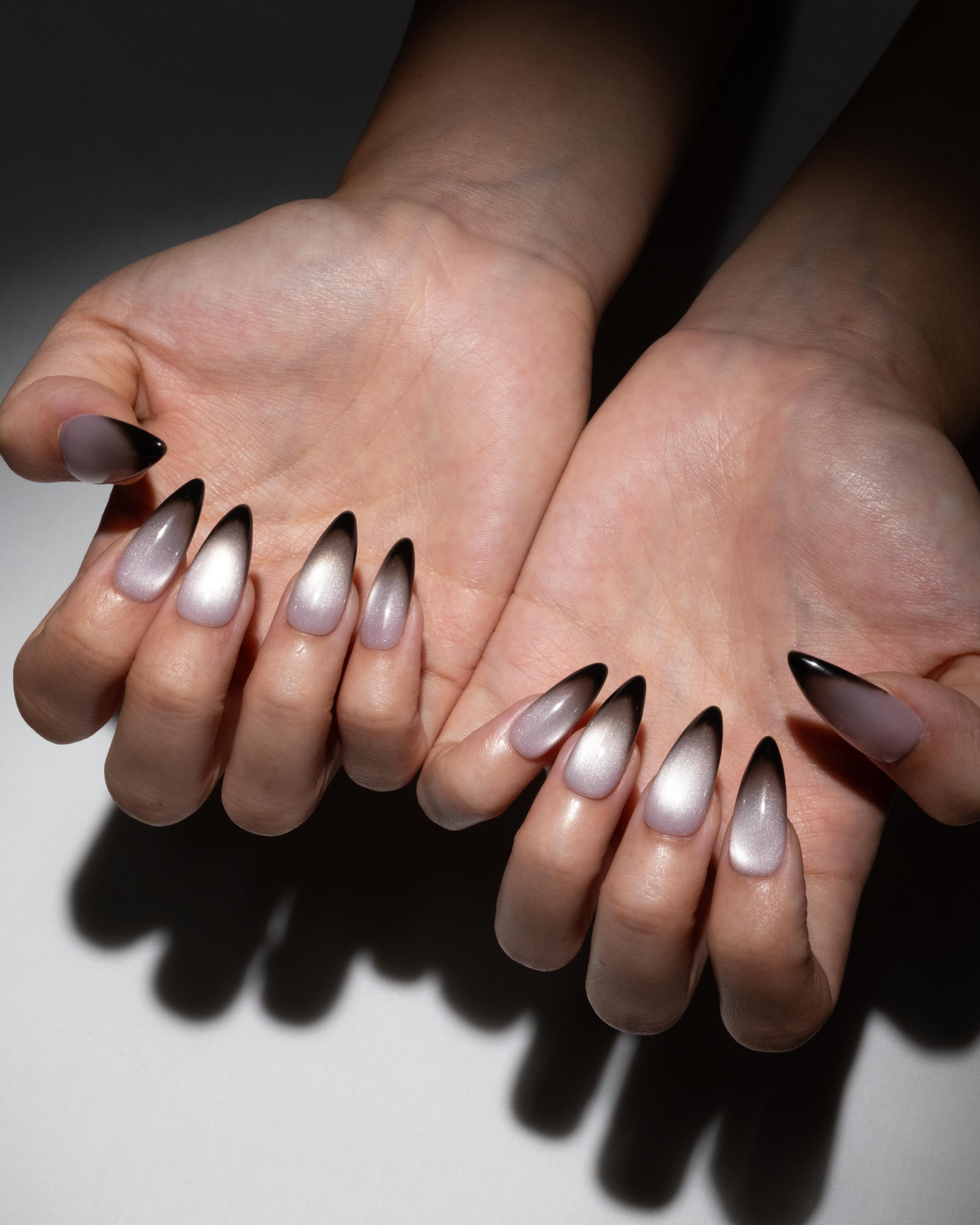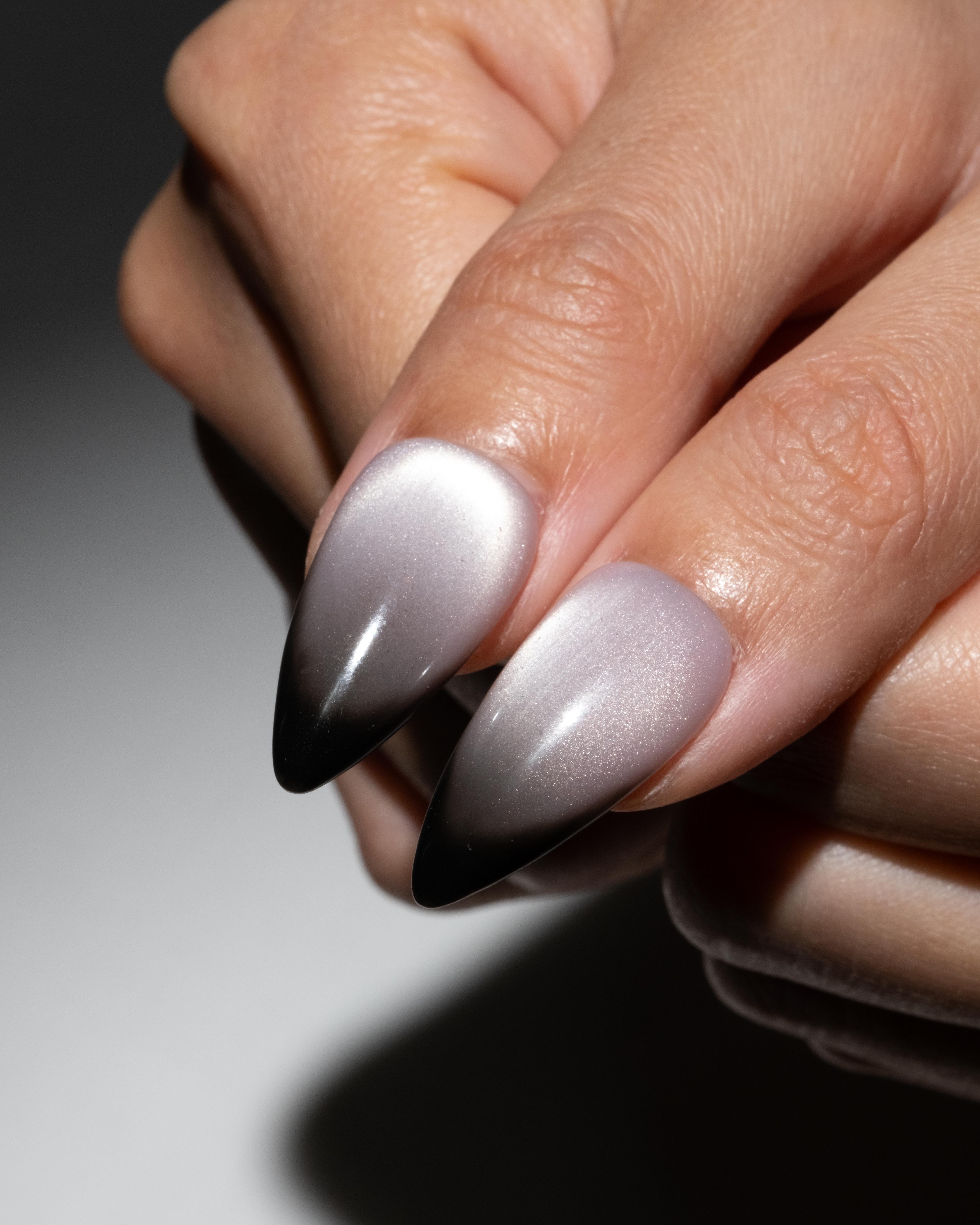 'Dusk' features a blush shimmer base that fades into deep black tips. Finished with a soft, light-catching glow for a seamless ombré that feels both delicate and dramatic.