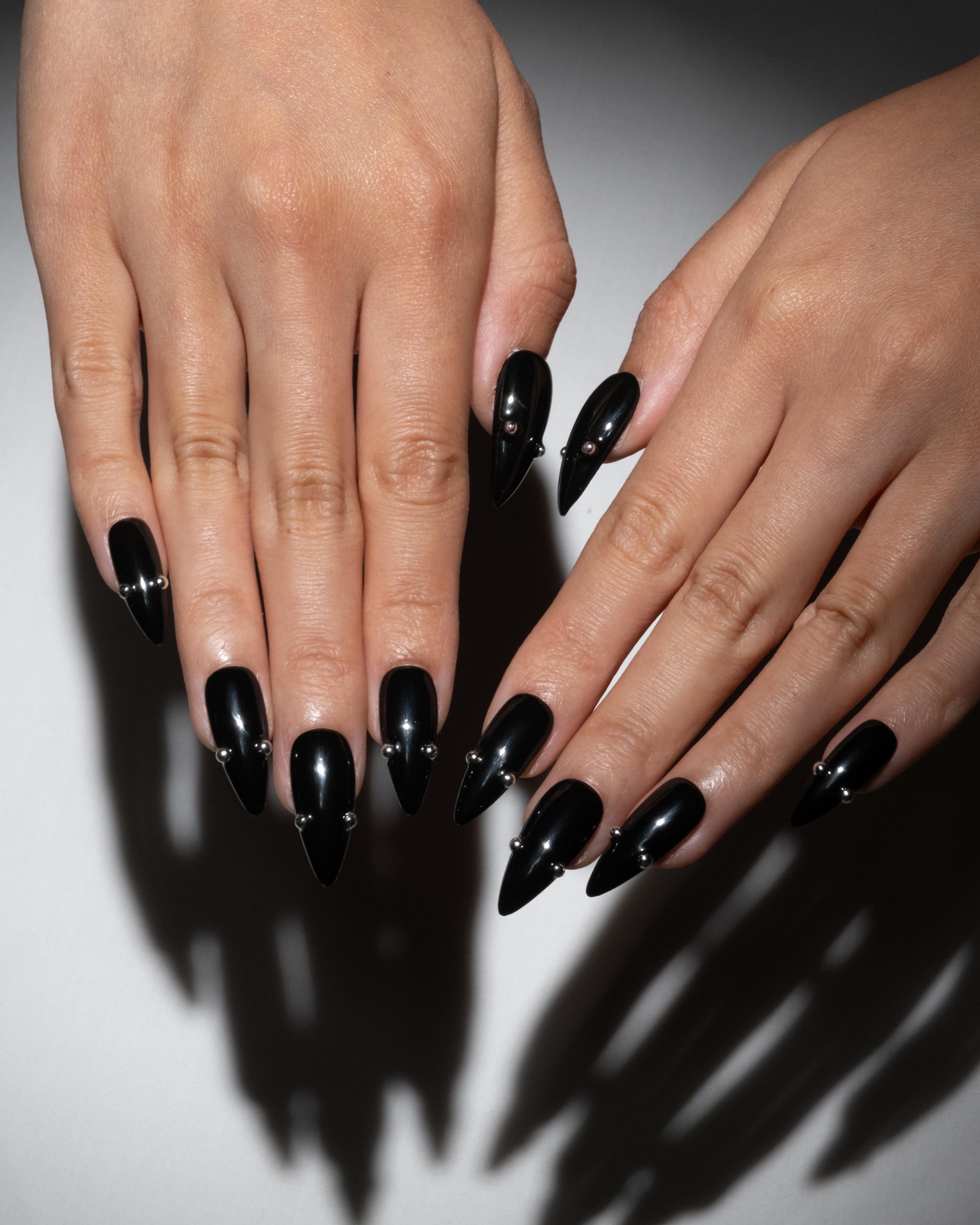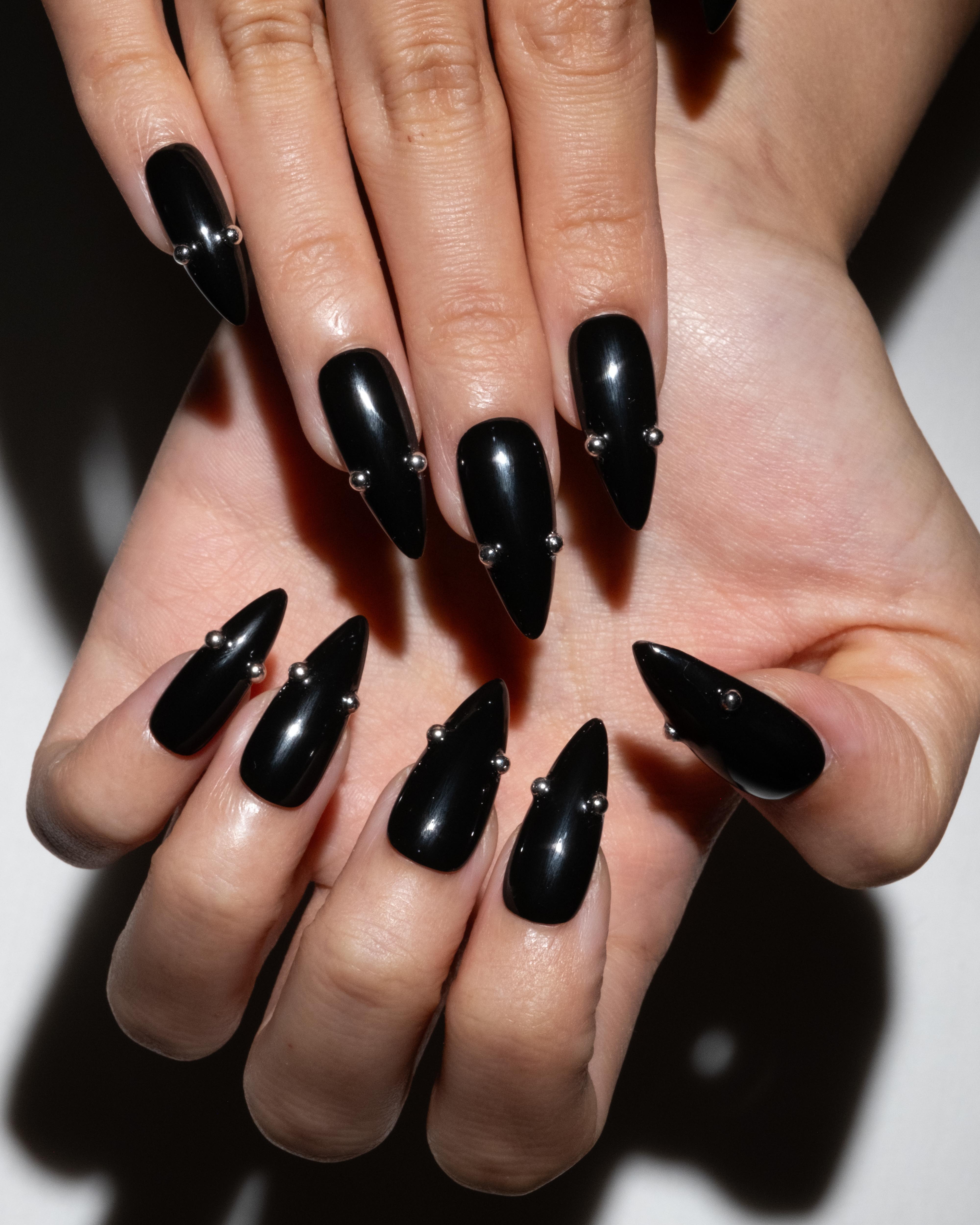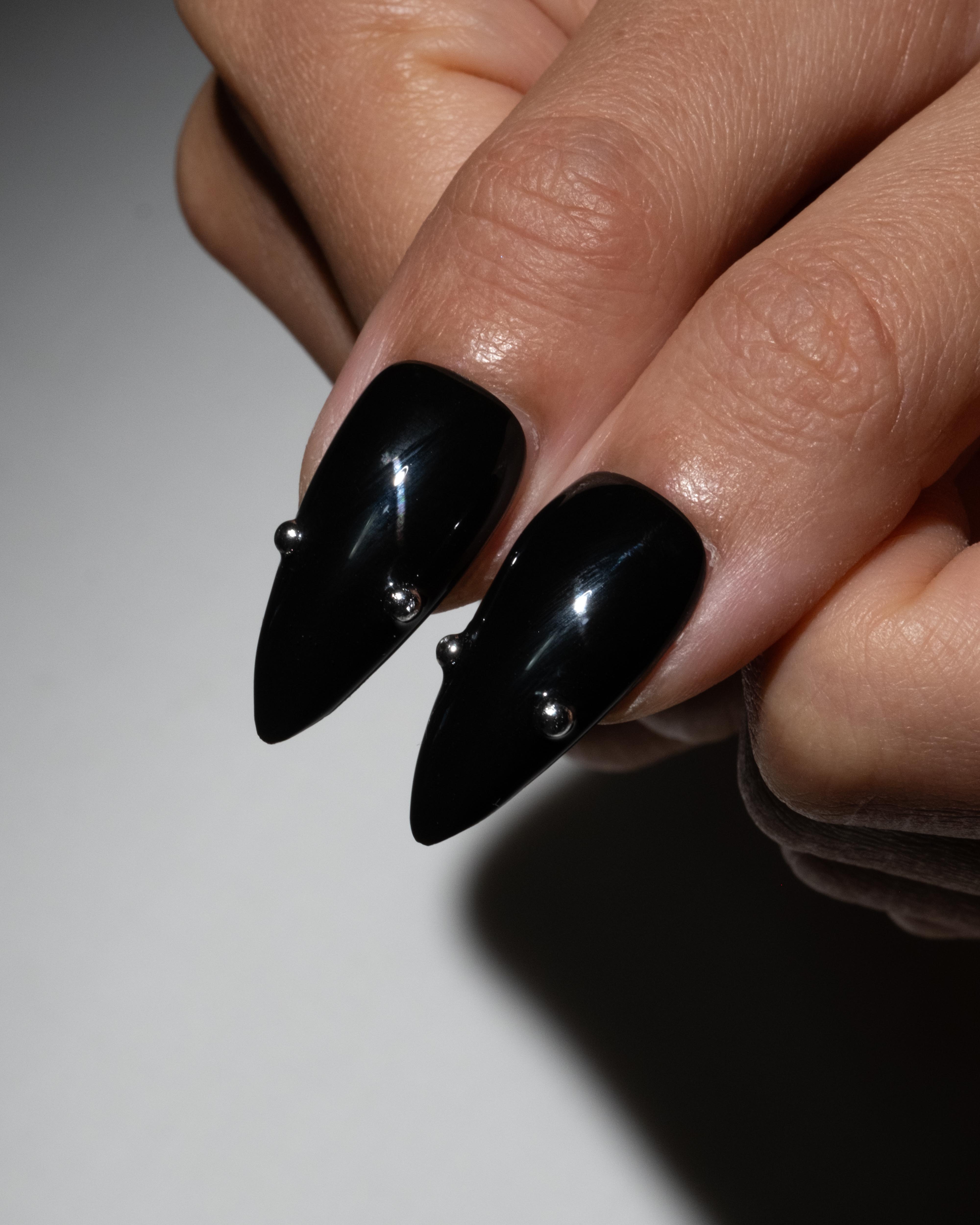 'Onyx' features a high-gloss black base finished with micro-silver piercing stud detailing to a create a sharp, high-impact design.