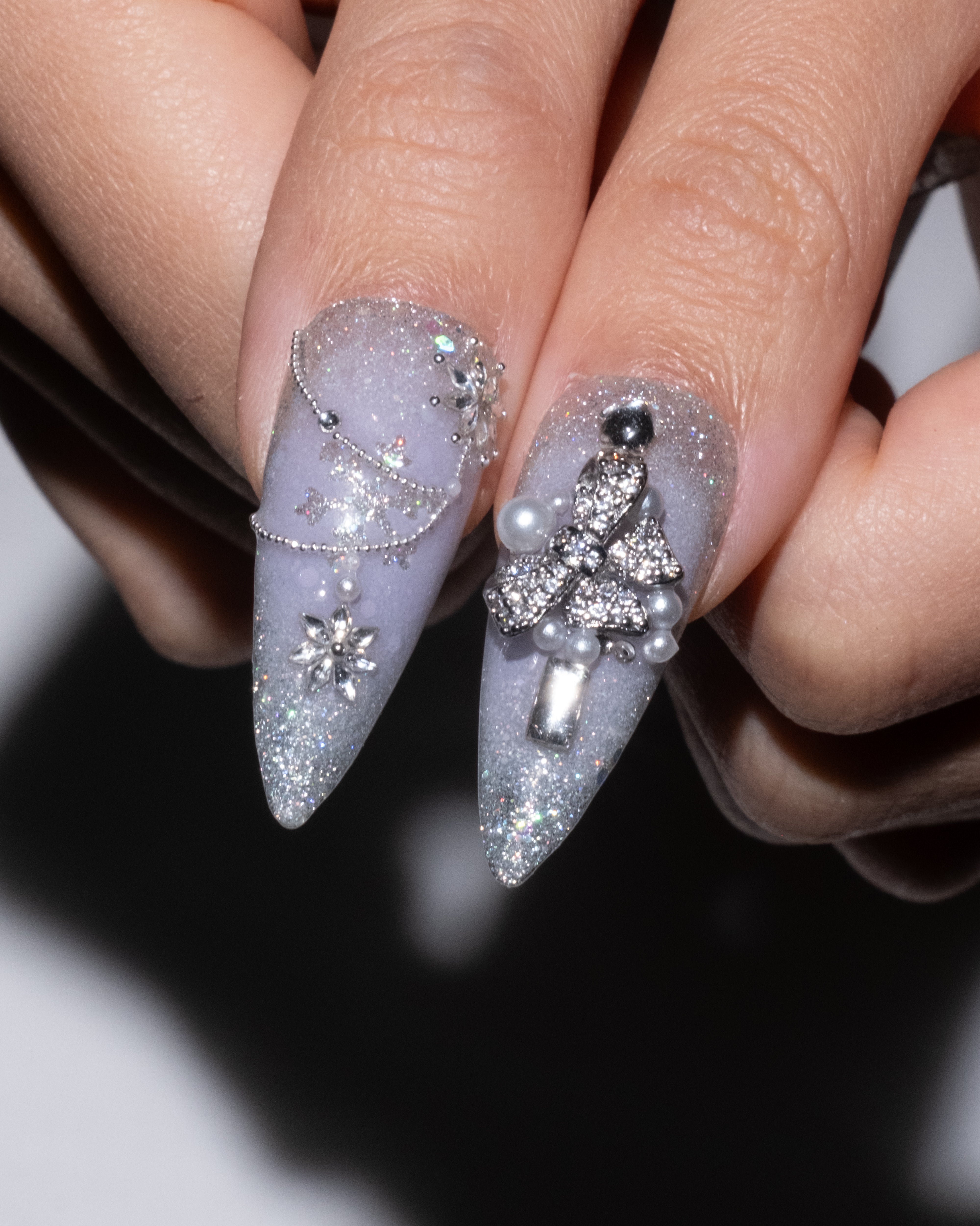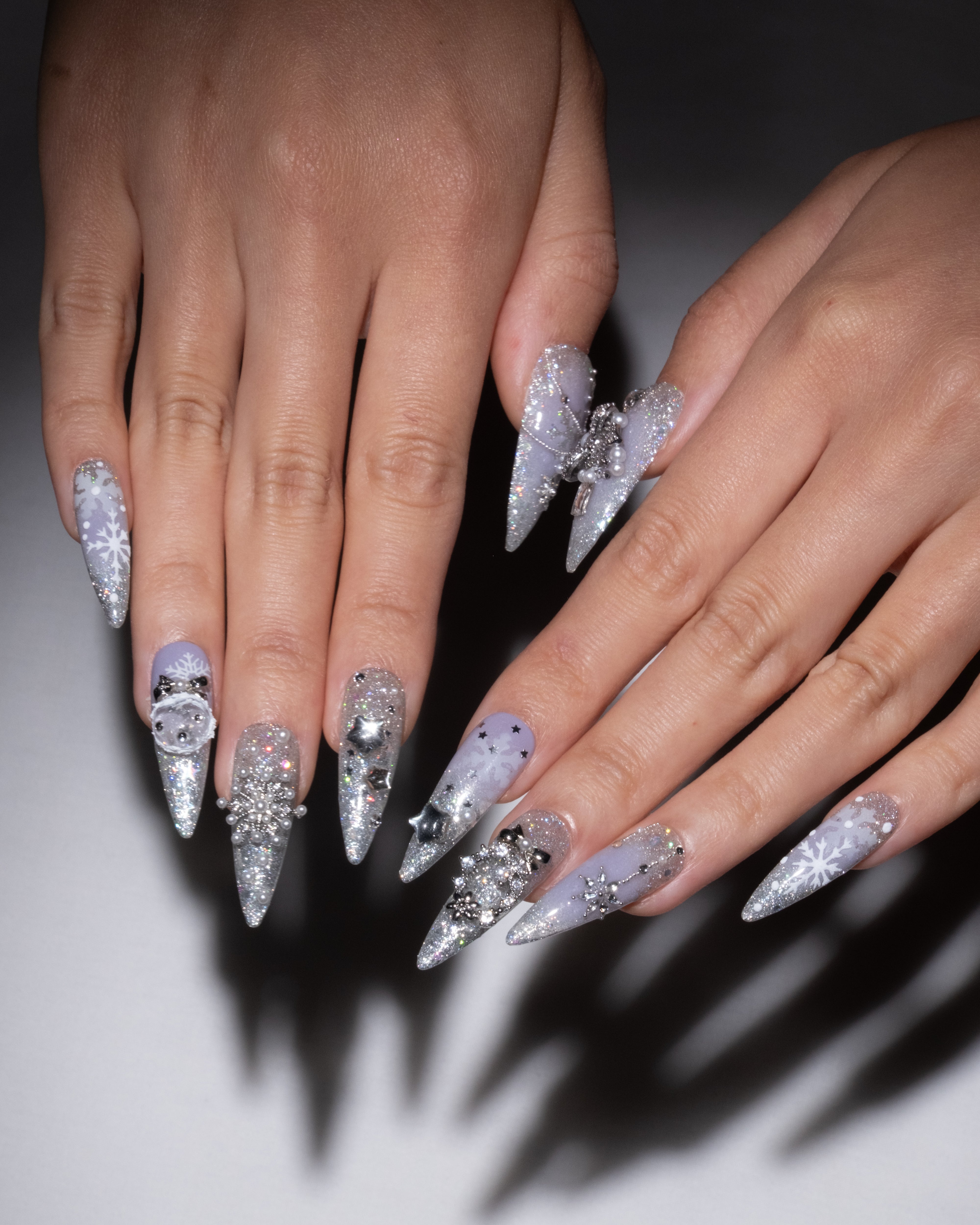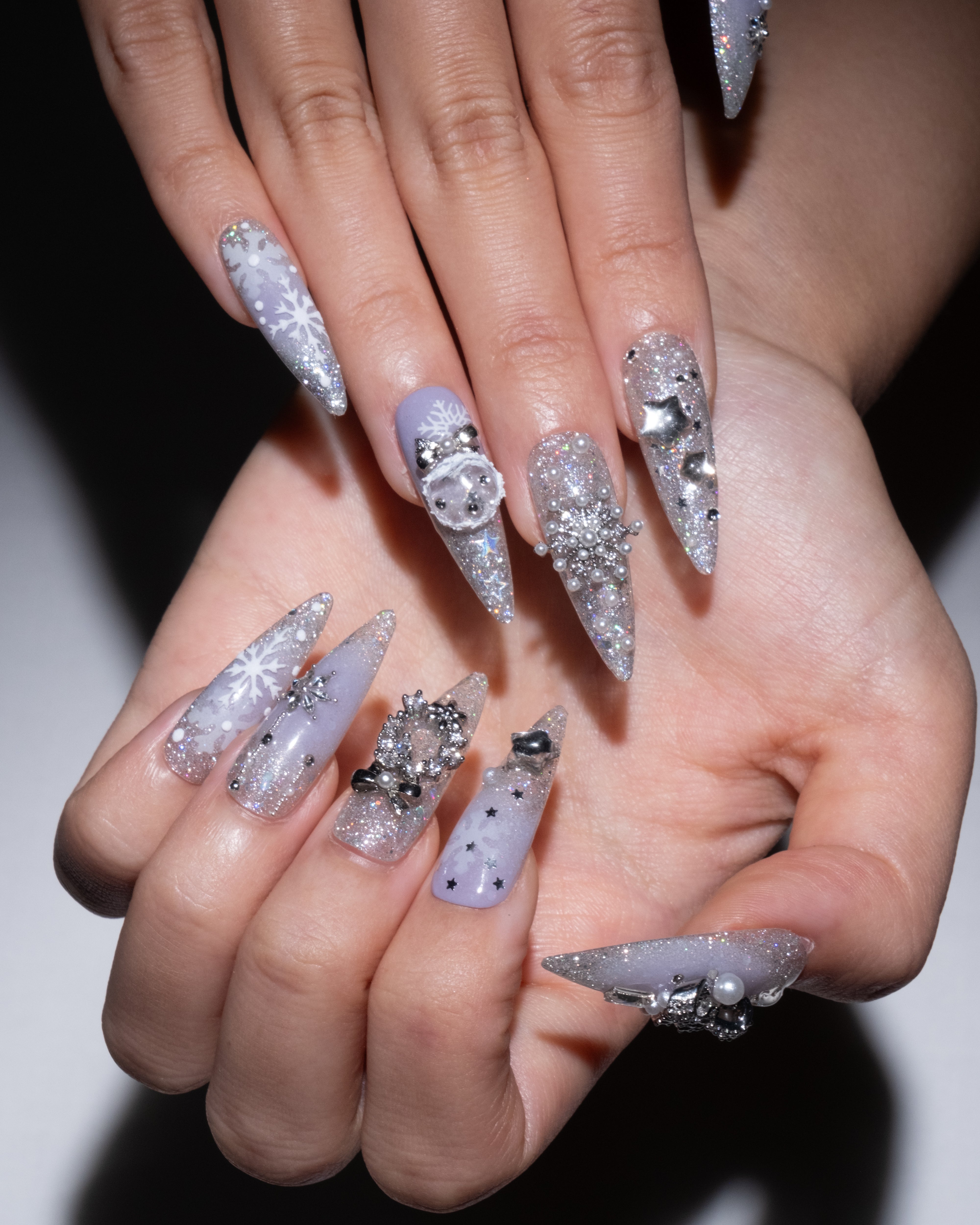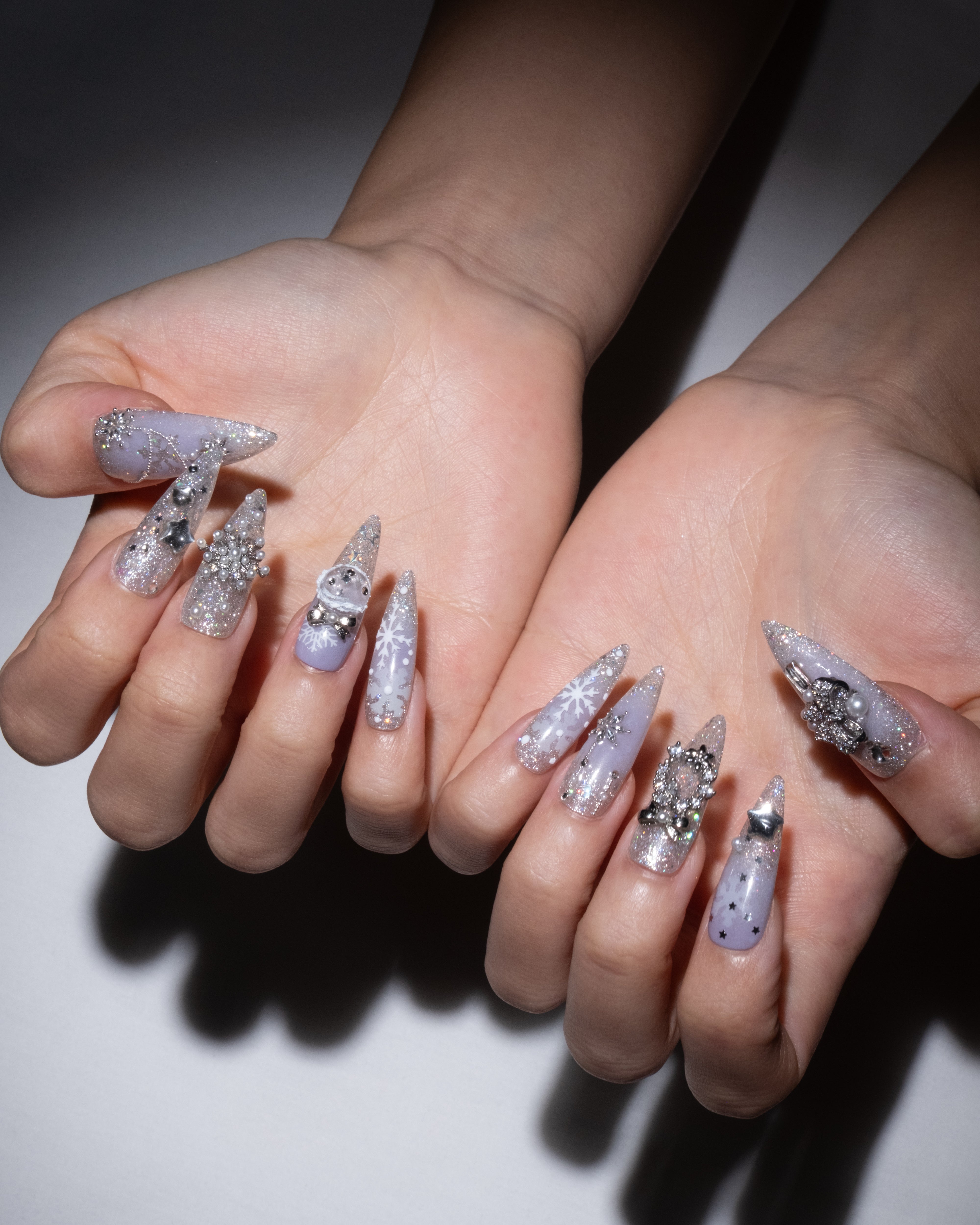 'Crystal Gala', a sparkling affair, showered with glitter and shining stars, is the perfect Press-On Nail design for the jolly season.