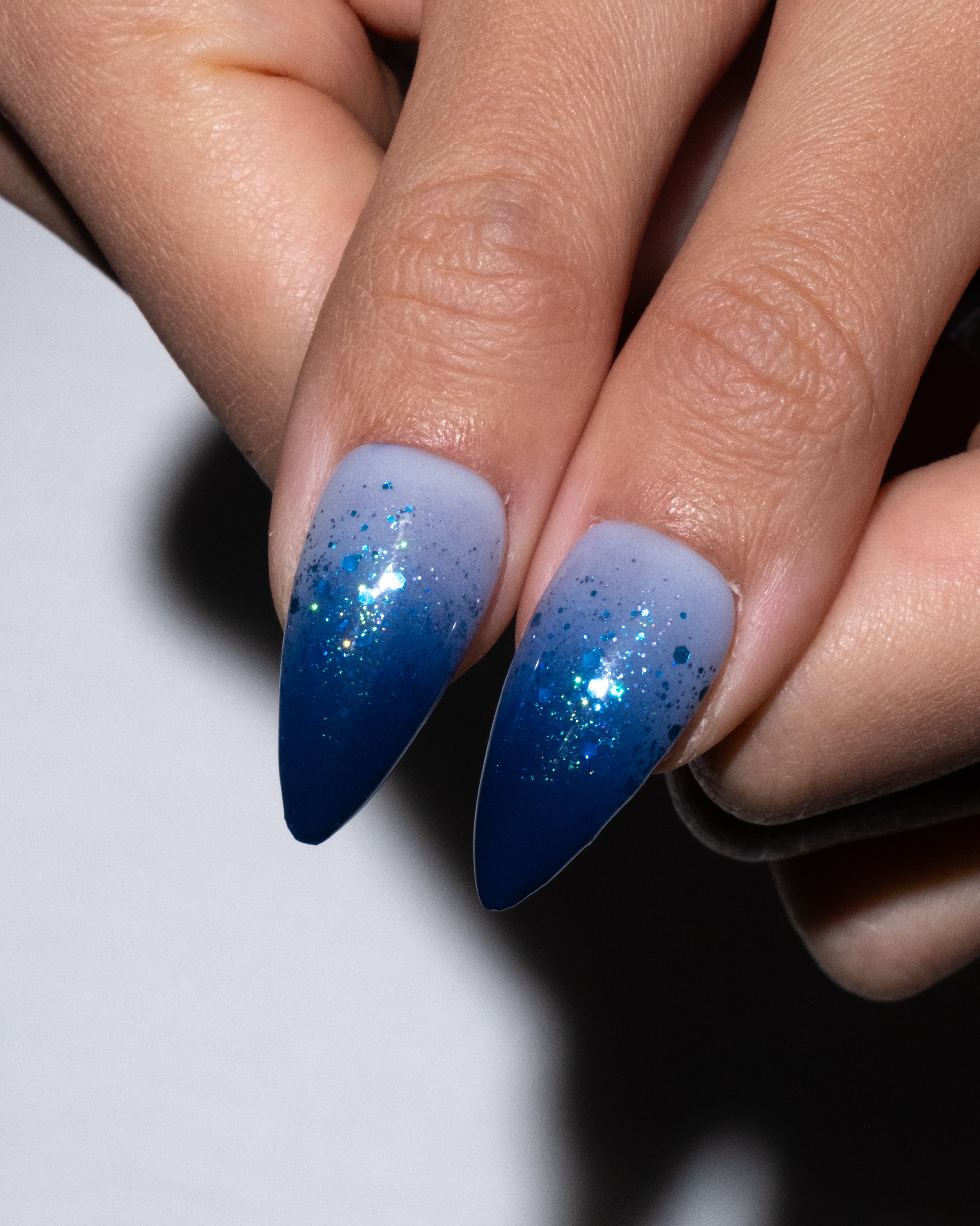 'Elsa' - part of The Holiday Collection, features a stunning glitter ombre french-tip in an medium-almond shape.
