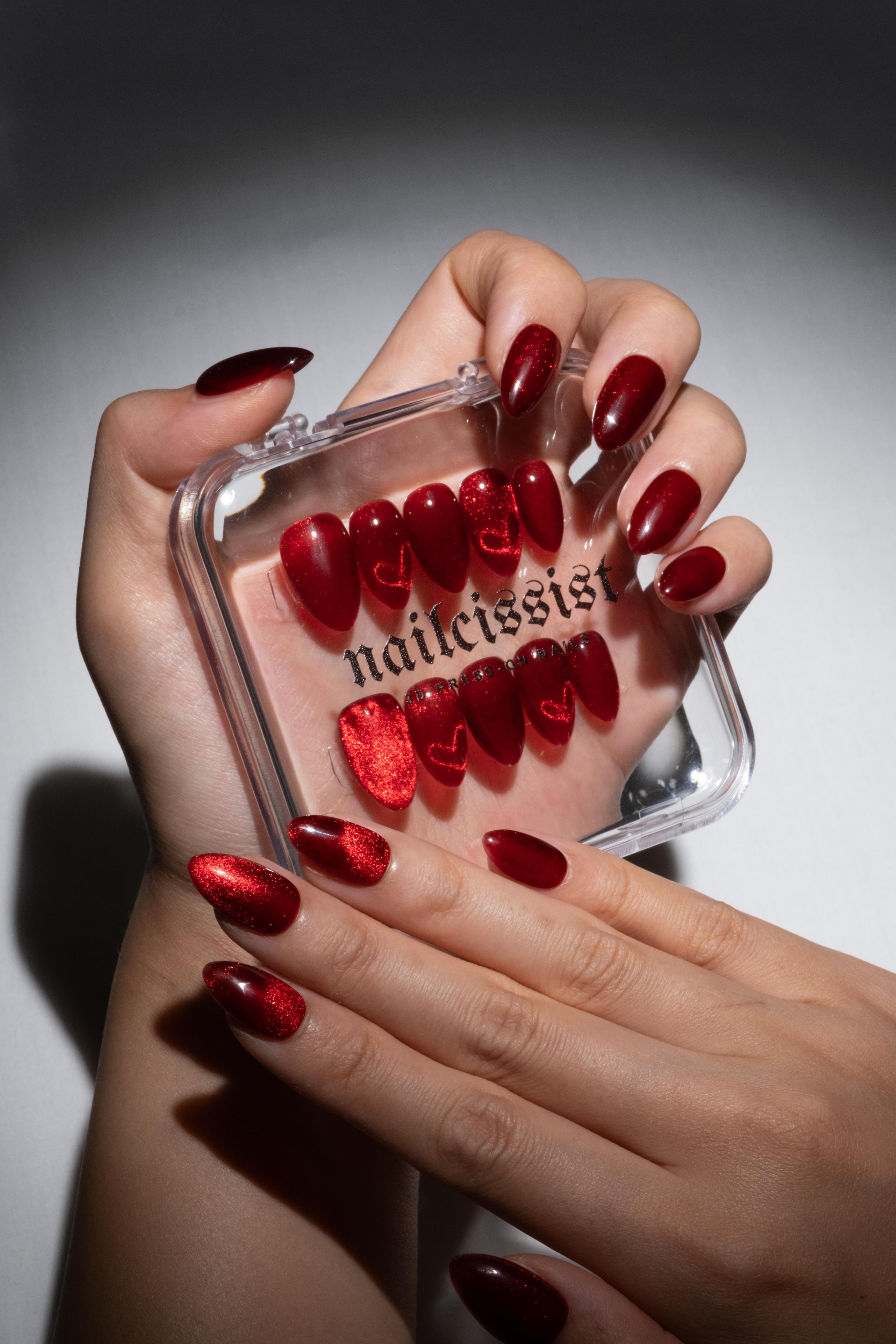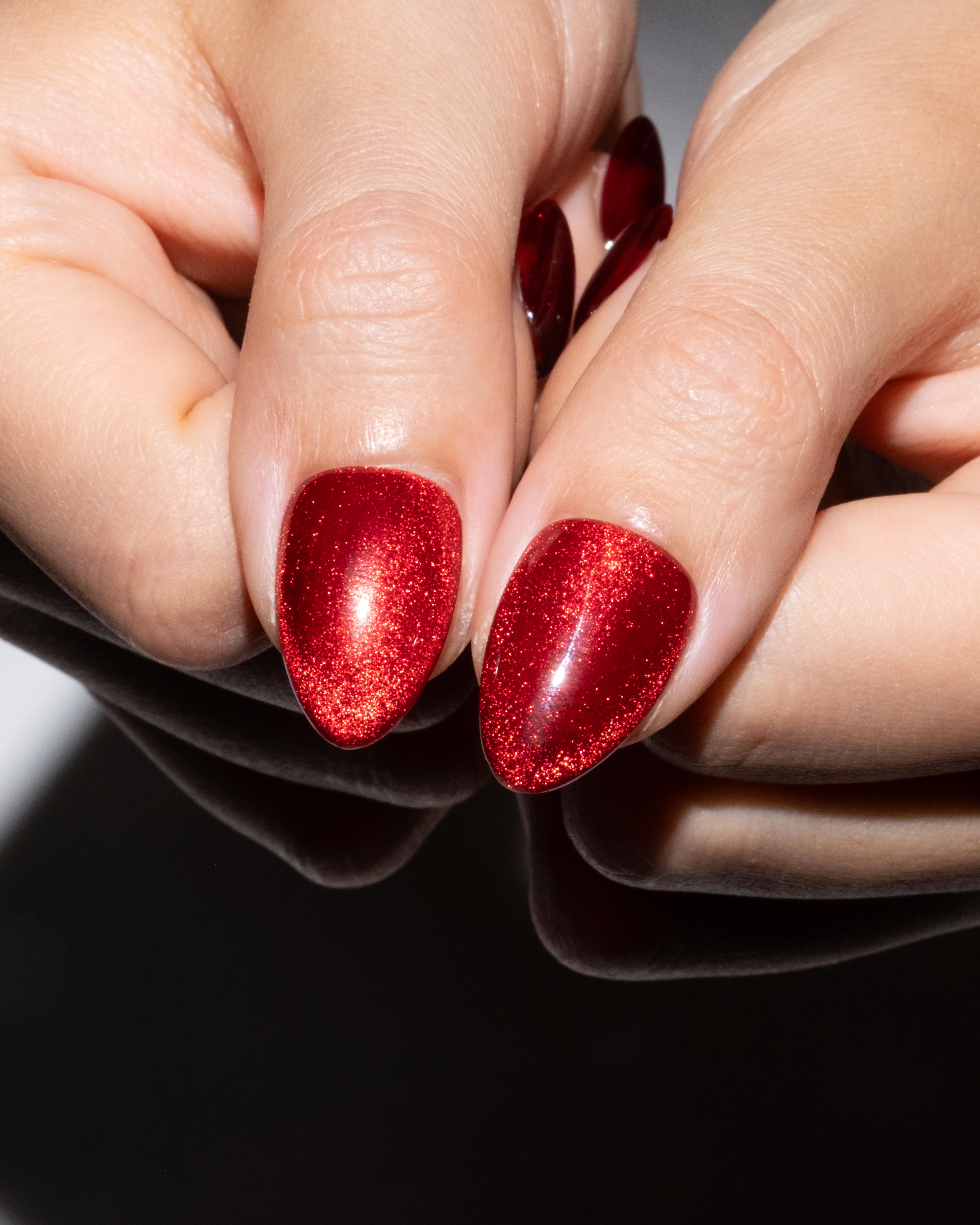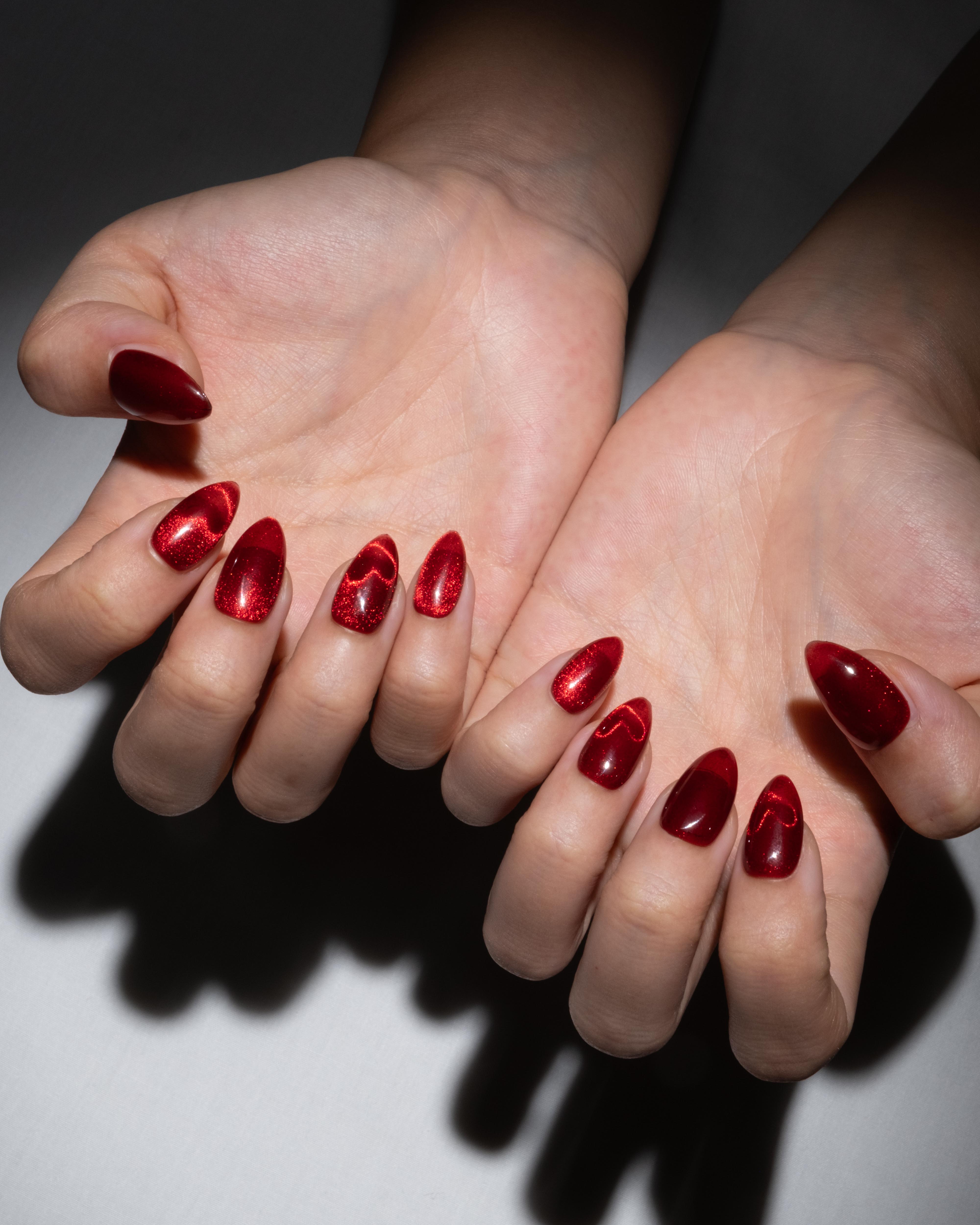 "Love Potion Red' is a deep red cat-eye press-on nail set with suspended heart detailing within the polish. Magnetic and luminous - this press-on nail set is the perfect blend of romance and wearability.