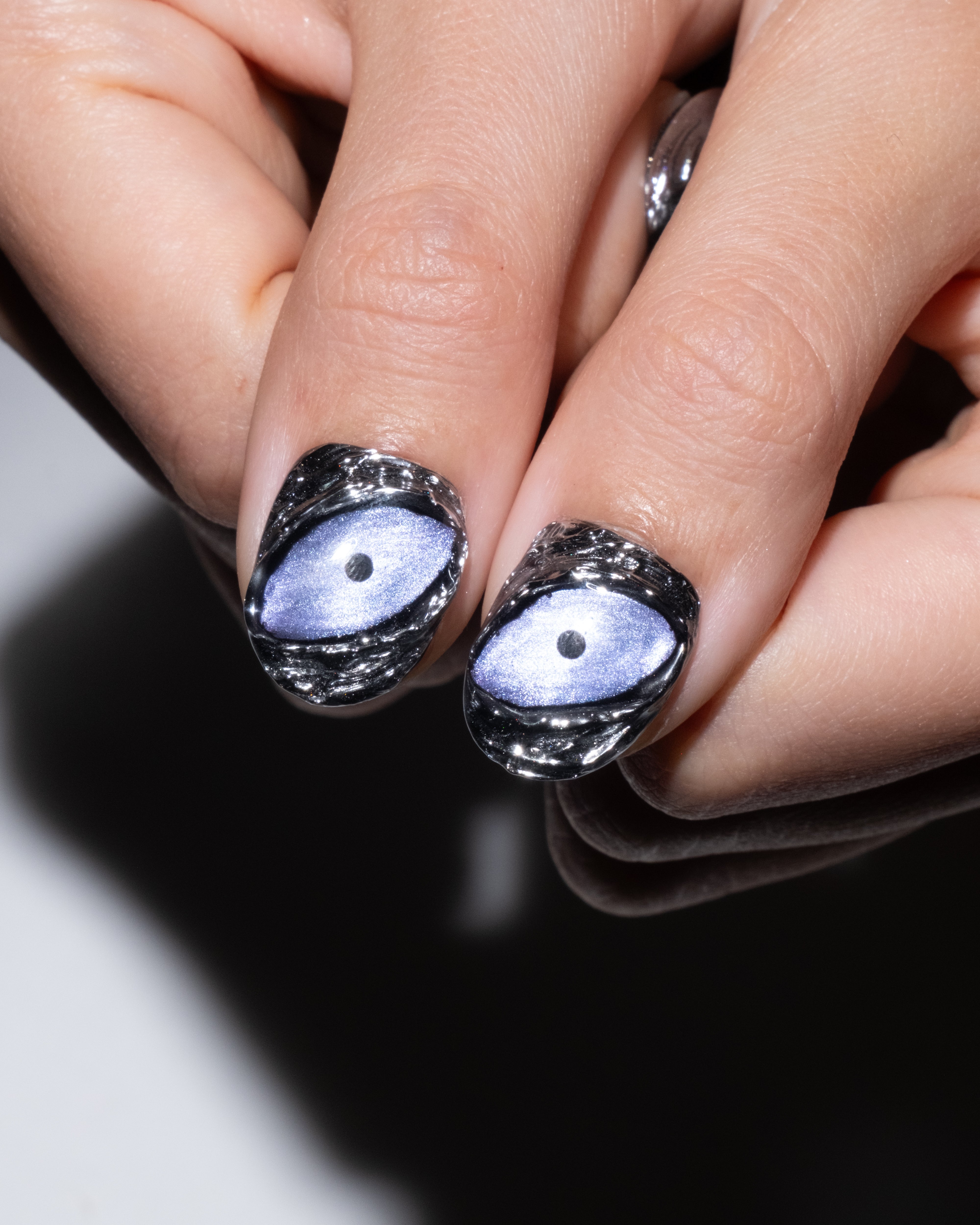 'Silver Dragon' features a short round shape with silver 3D elements, inspired by silver dragon scales, and a center piece glistening purple dragon eye on the thumb.