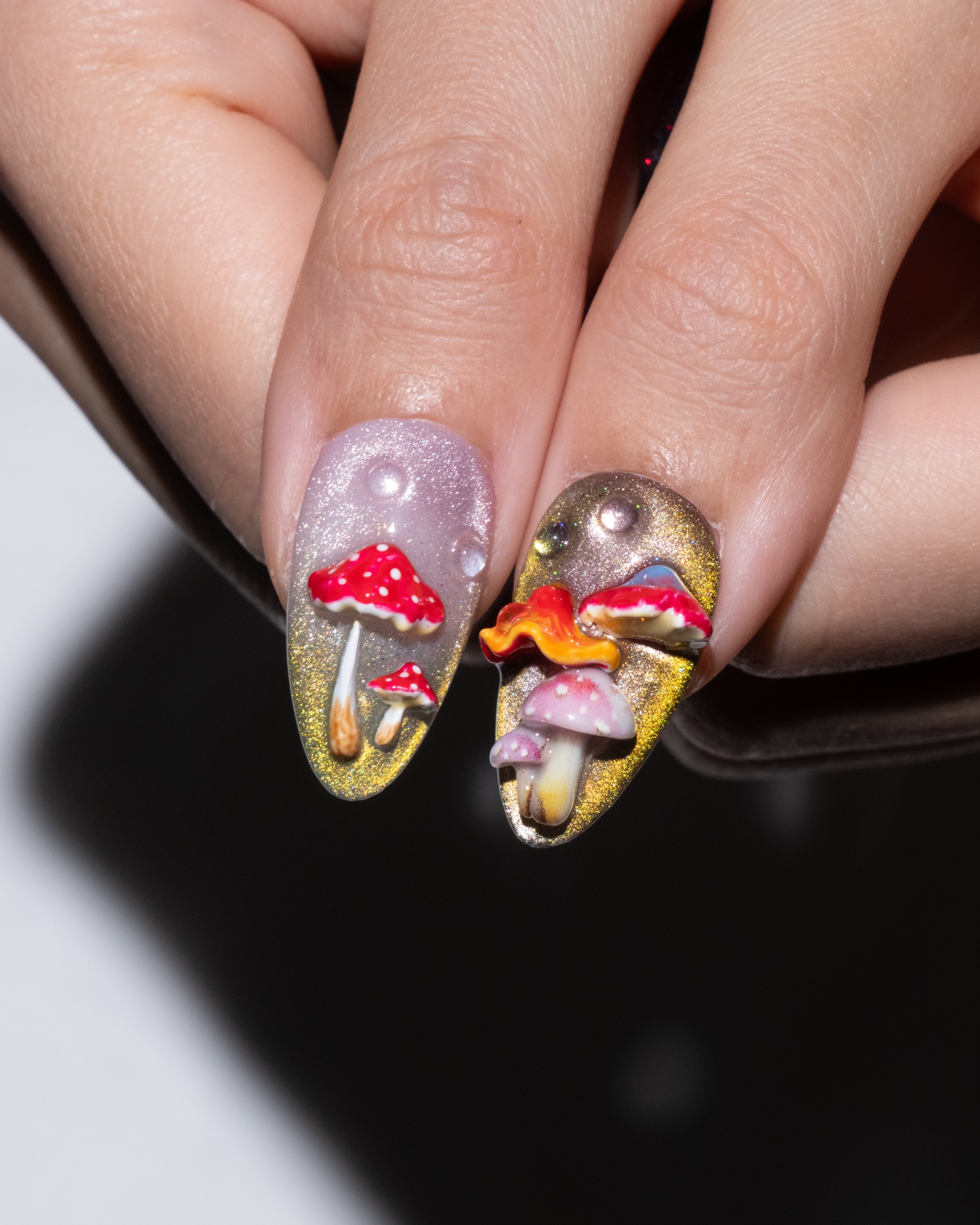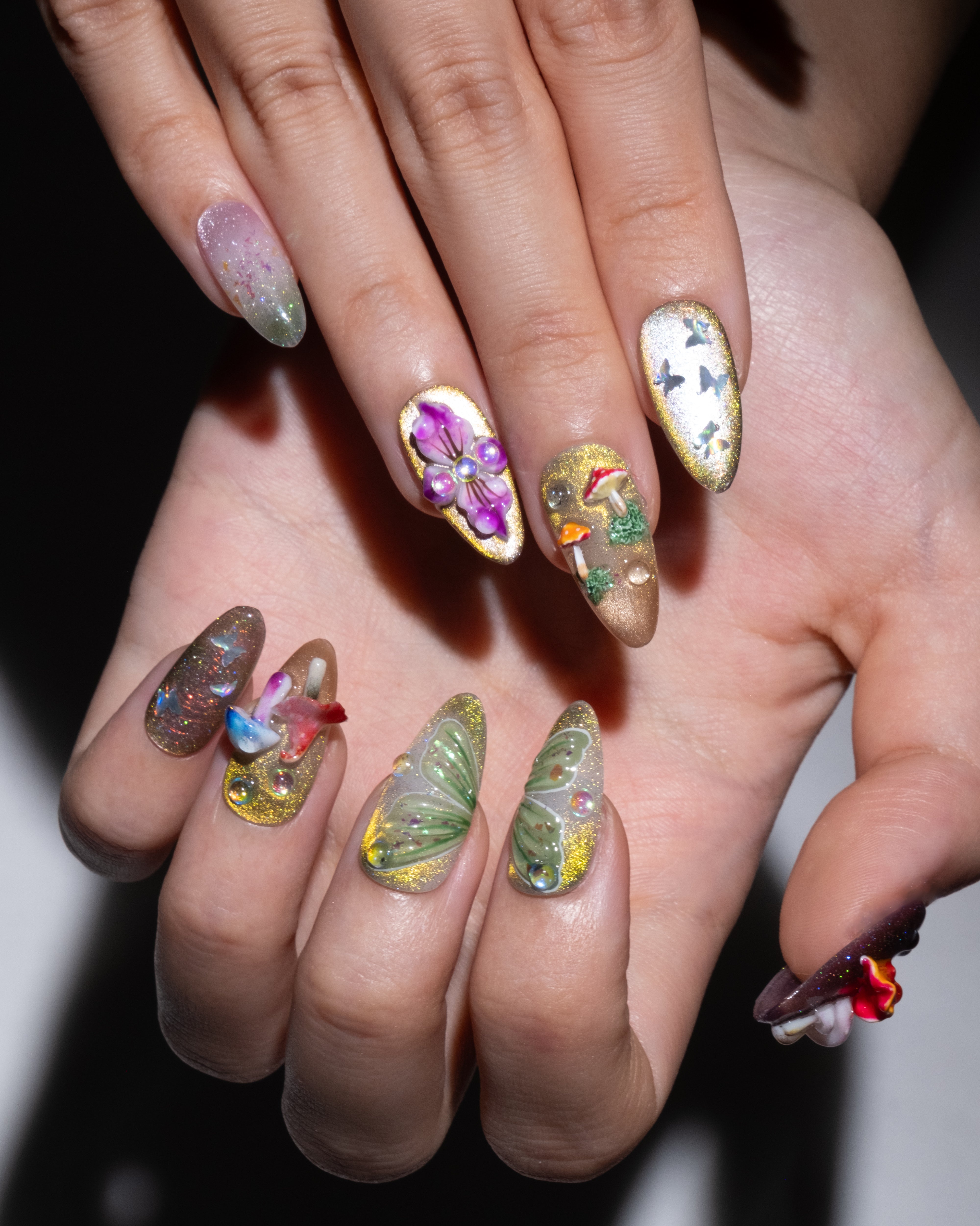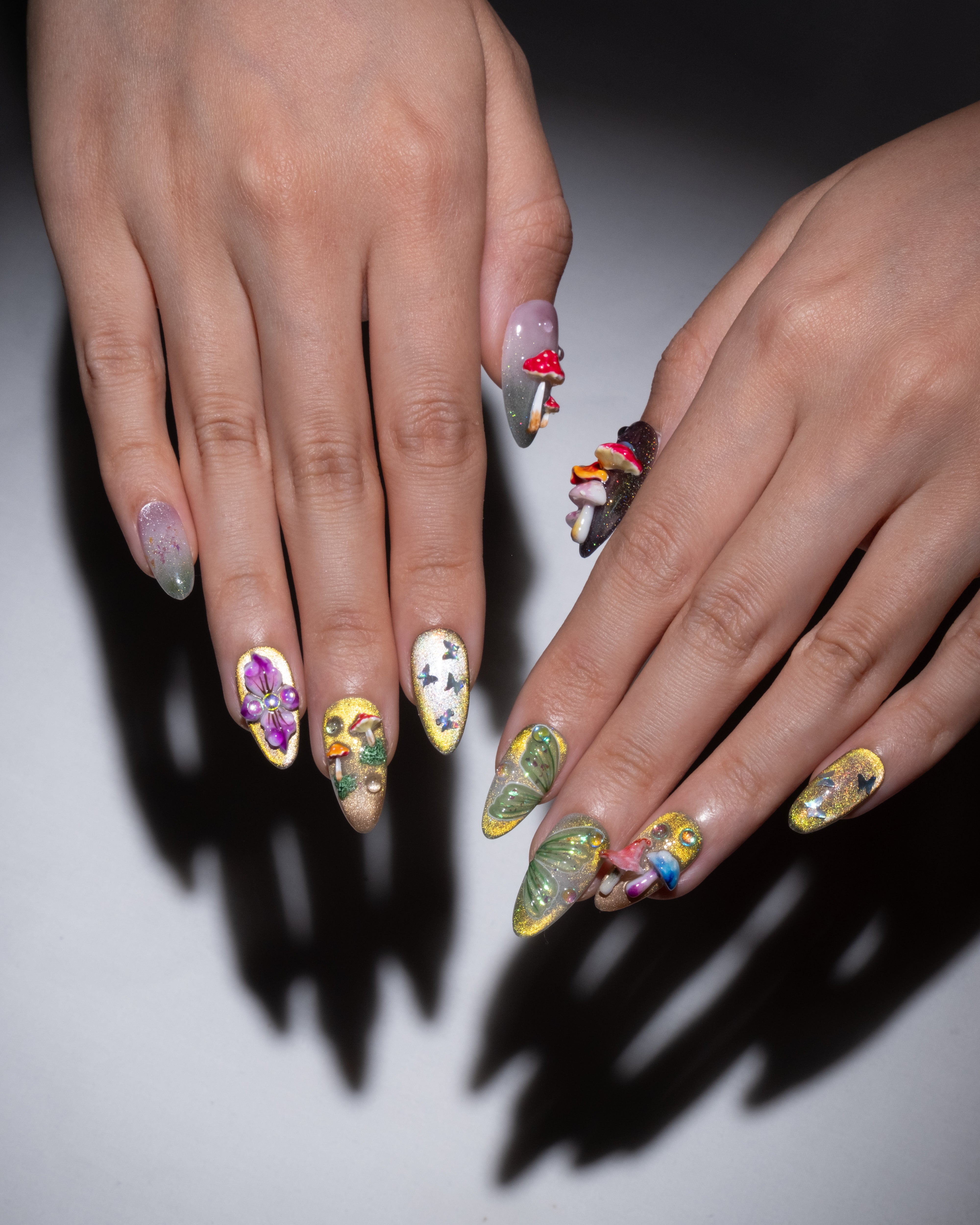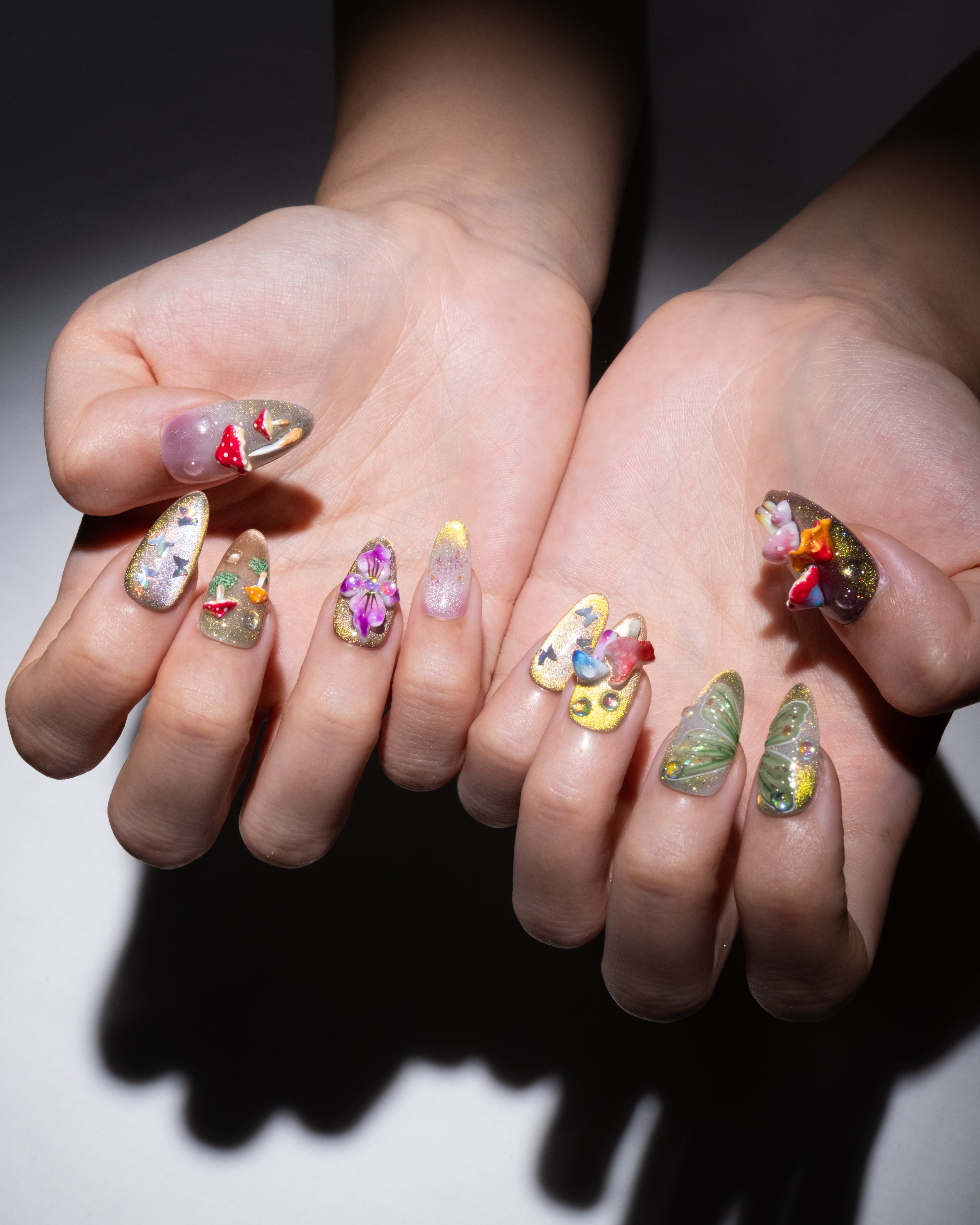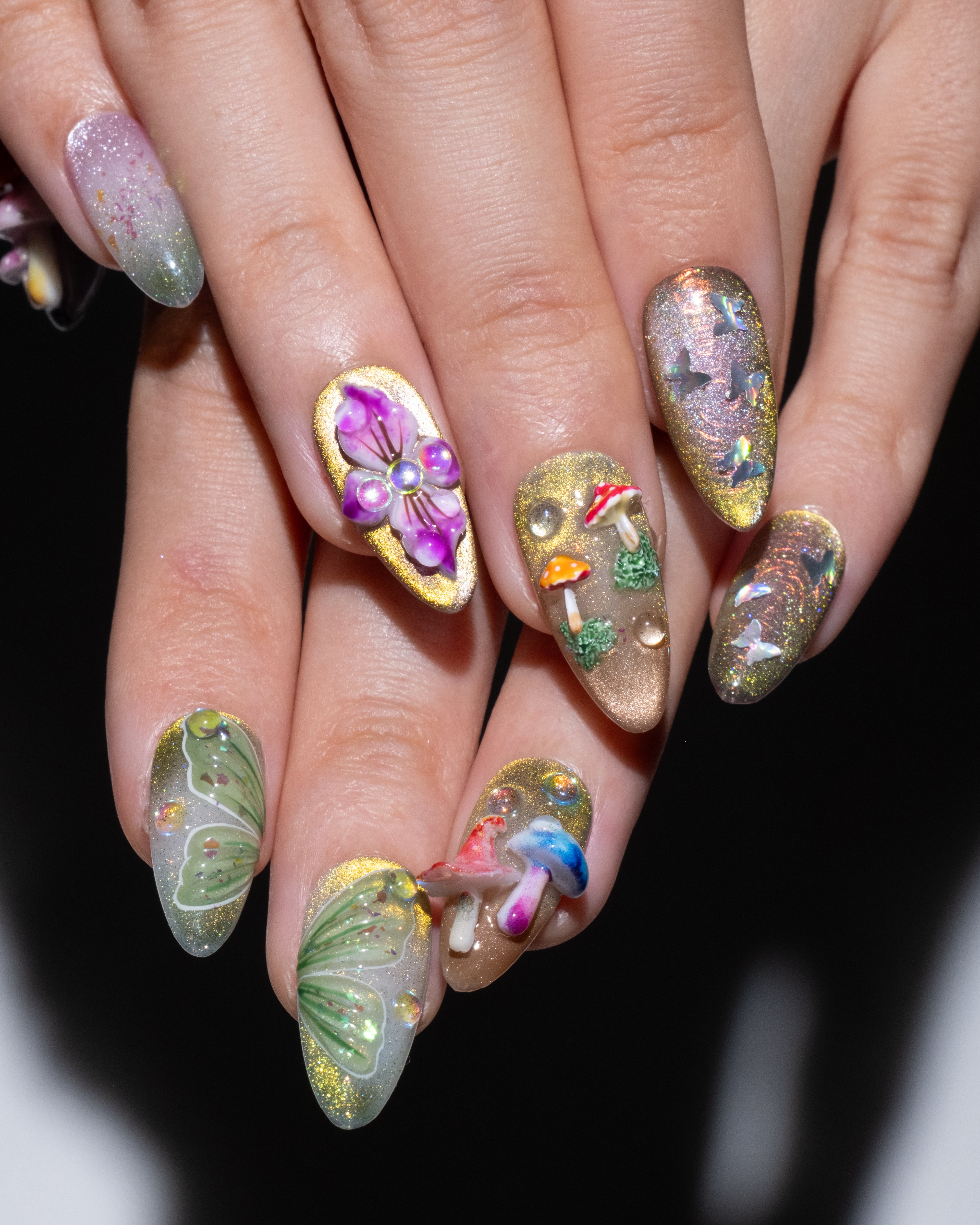 Alone in a mystical fairy forest, you are surrounded by creatures of wonder. Inspired by the DUNGEONS & DRAGONS universe, ‘D&D Feywild Fairy’ features vibrant cat-eye glitter bases with colourful mushrooms, 3D hand-sculpted flowers, and ethereal butterfly wings.