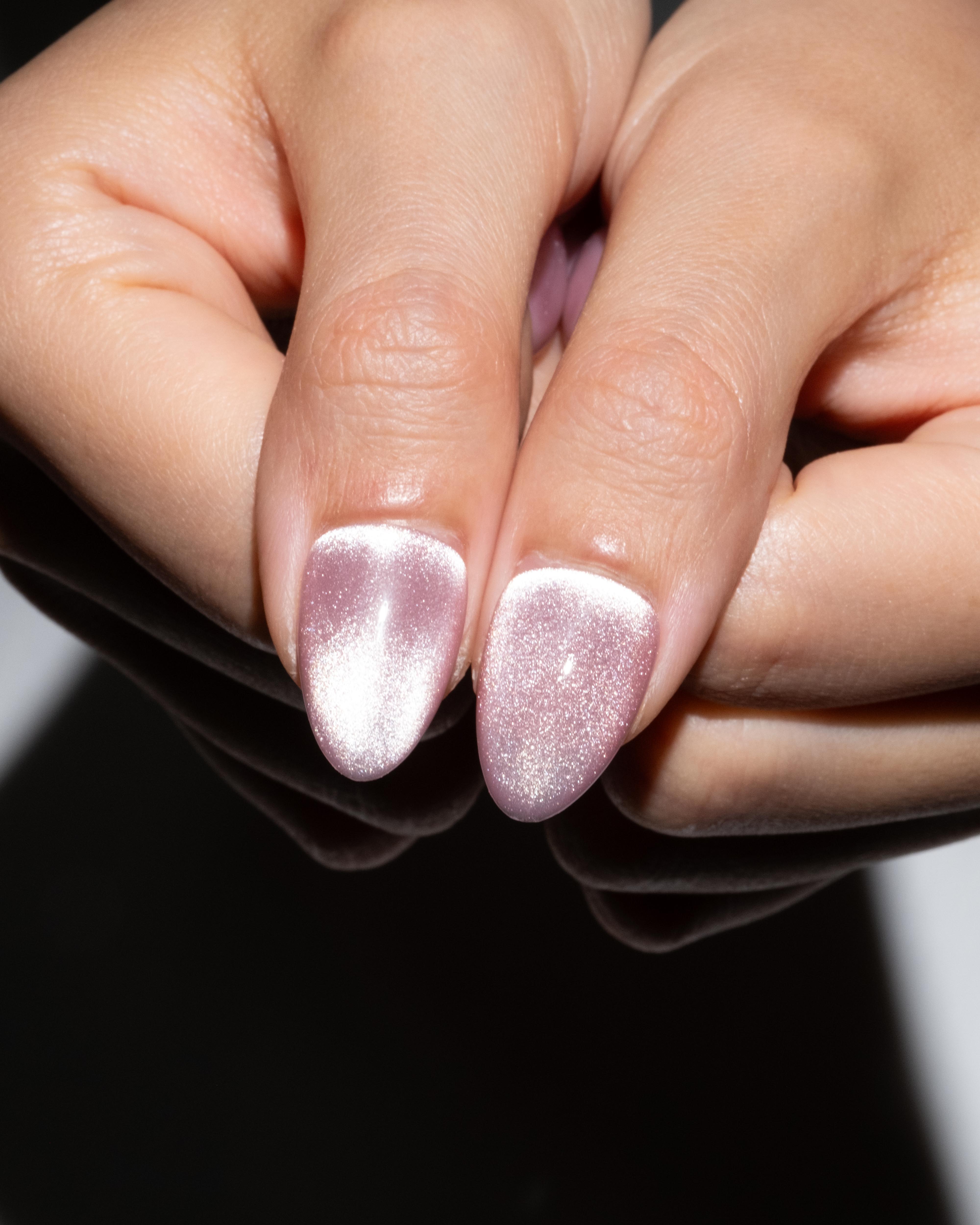 'Love Potion Pink' is a soft pink cat-eye press-on nail design featuring subtle heart detailing suspended within the polish. Minimal, wearable and romantic.