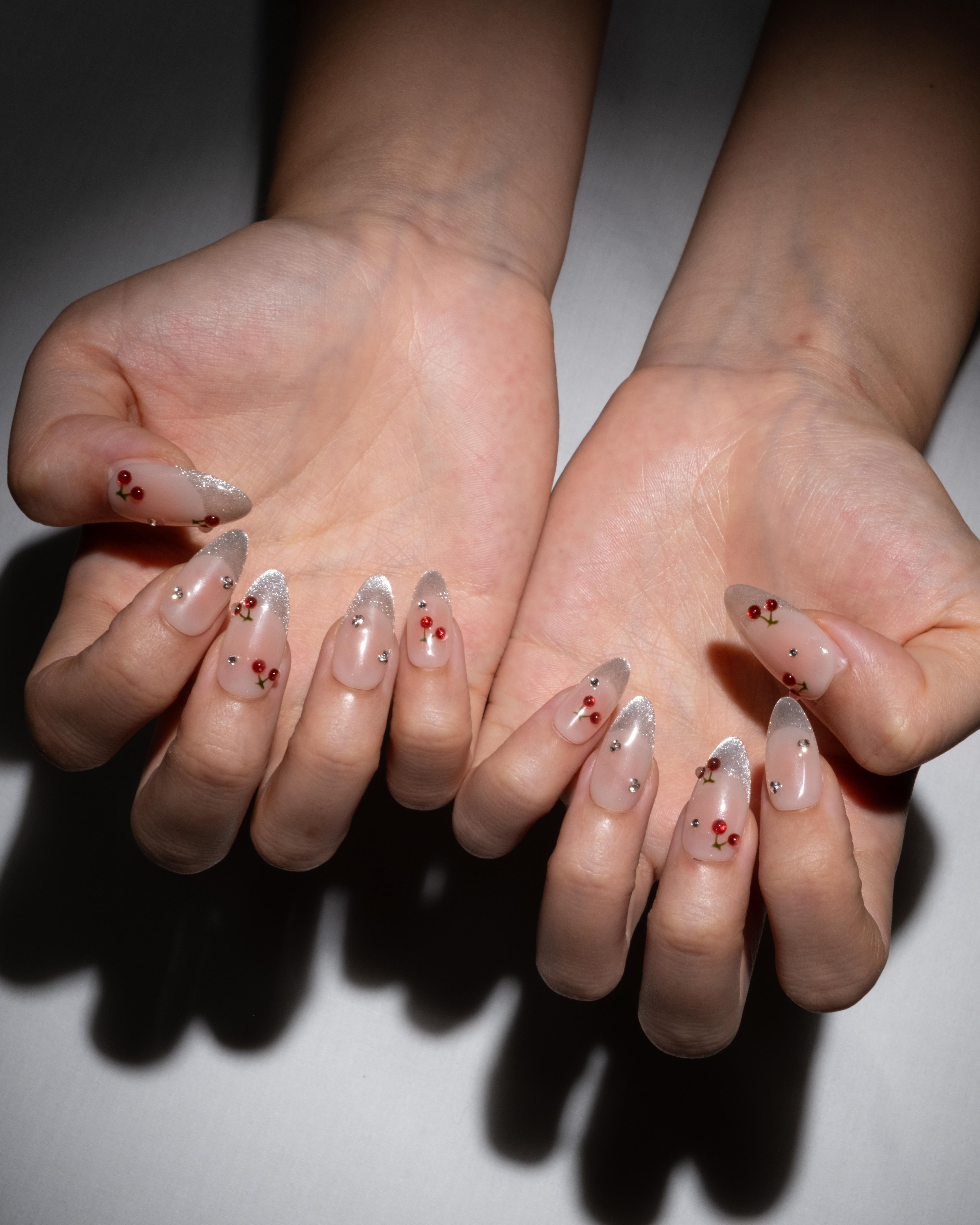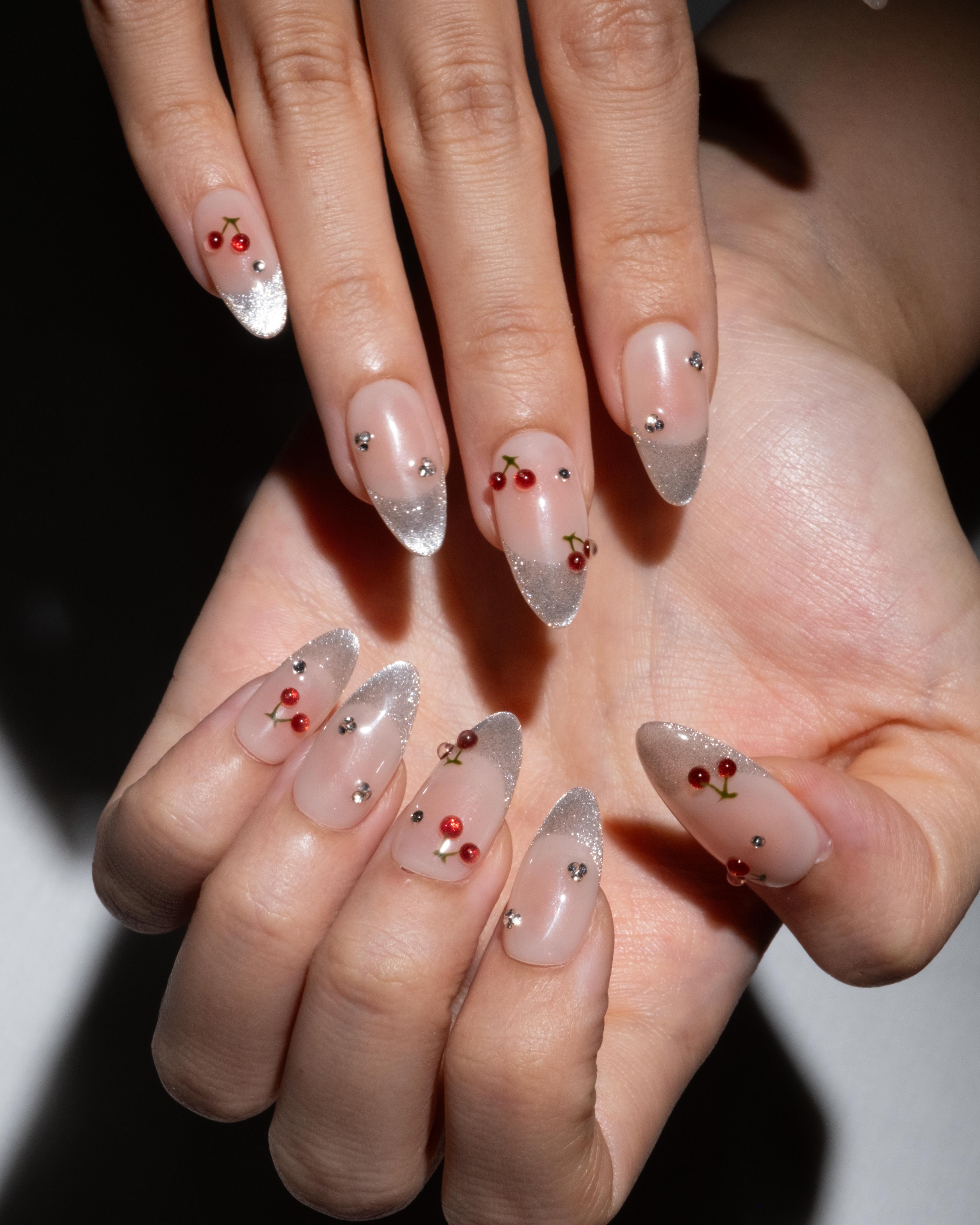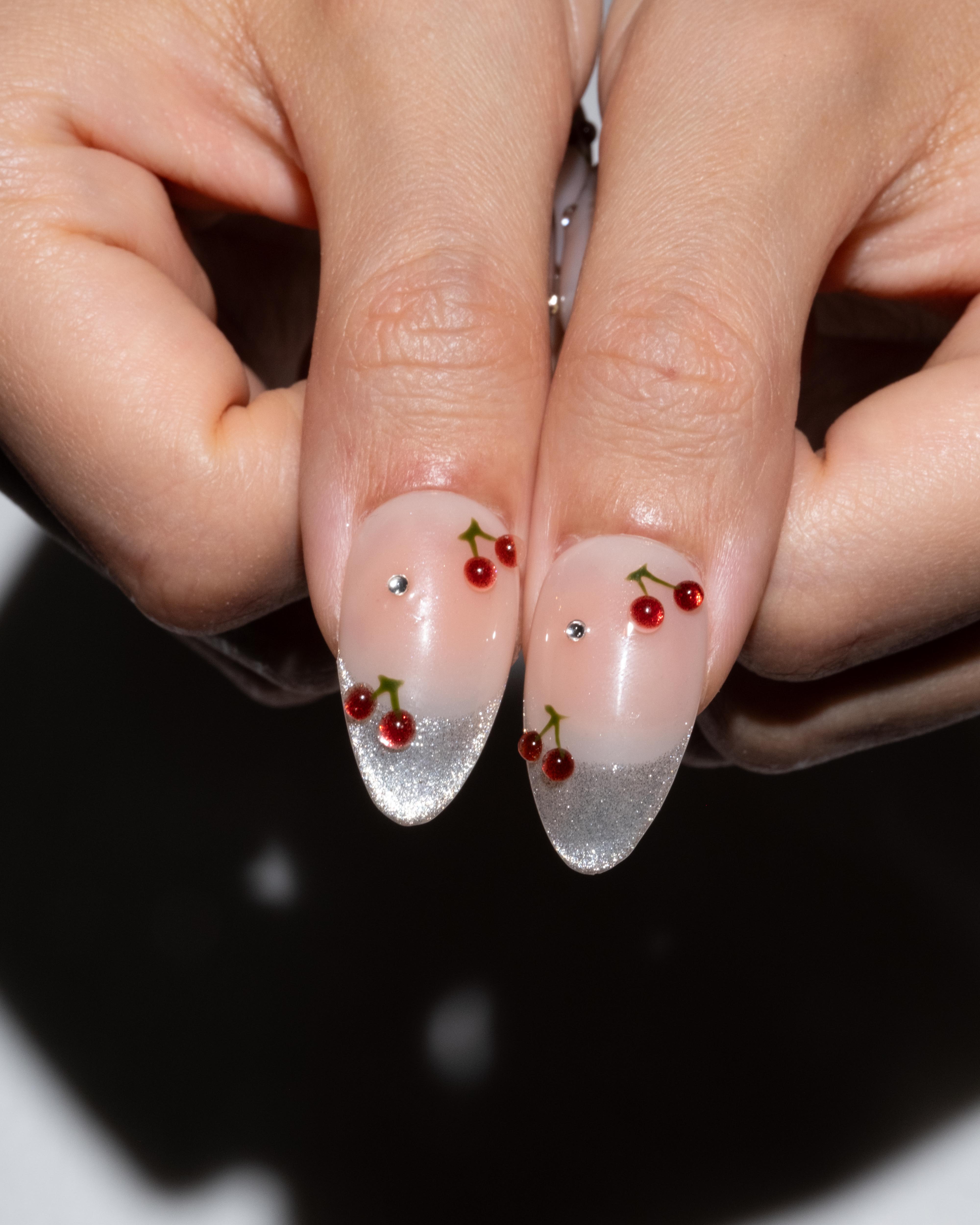 'Pop My Cherry' features a stunning glitter french tip with scattered gemstones and 3D cherries.