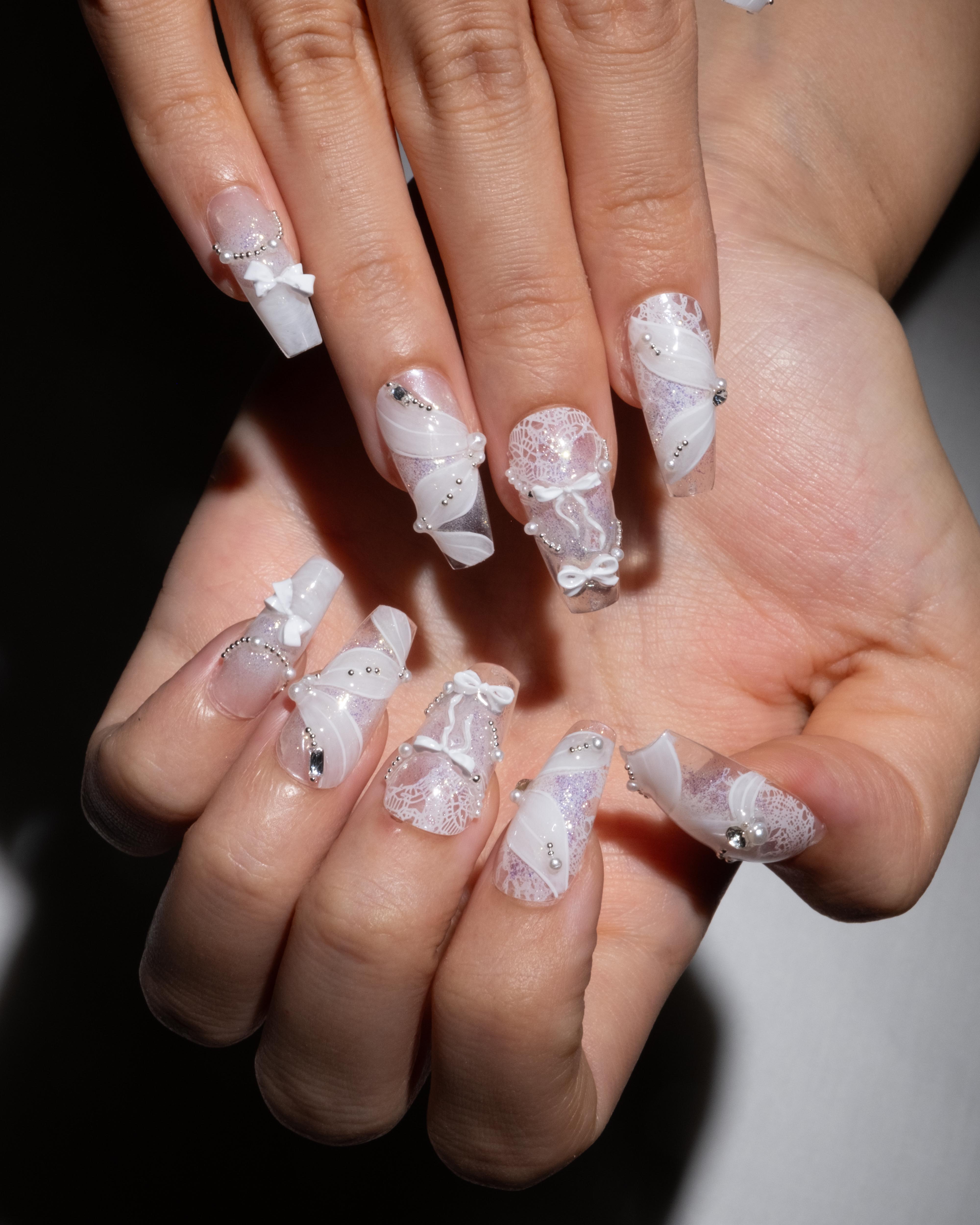 'White Promise' is a monochromatic press-on nail design with soft ivory tones, detailed lace textures, pearls, and delicate bow accents. Timeless, refined, and quietly ceremonial in a classic medium coffin shape.